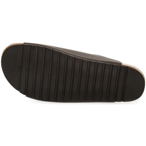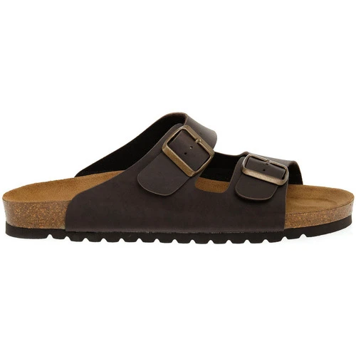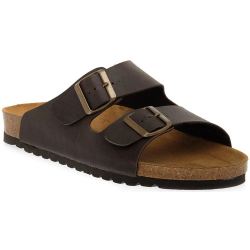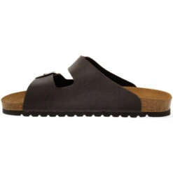 Ciabatte regolazione due fibbie, similpelle sintetico, 100% made in Italy. Sottopiede in gomma-sughero ricoperto in pelle e suola microporosa. Colore prodotto: t. moro.