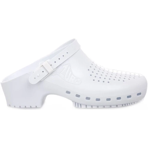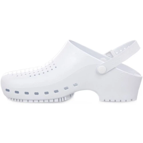 Zoccoli Calzuro modello S, certificati CE, latex free, antistatici, suola antiscivolo EN ISO 20347:2012, con fori laterali per la traspirazione del piede e tomaia verde forata. Calzuro è un Dispositivo Medico di Classe I non sterile. Modello con plantare e cinturino. Colore: Bianco.