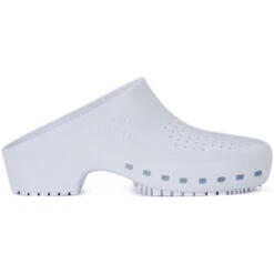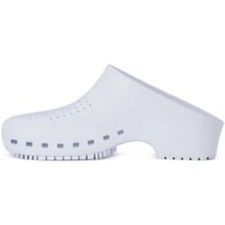 Zoccoli Calzuro modello S, certificati CE, latex free, antistatici, suola antiscivolo EN ISO 20347:2012, con fori laterali per la traspirazione del piede e tomaia forata. Calzuro Classic è un Dispositivo Medico di Classe I non sterile.
