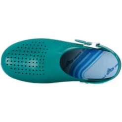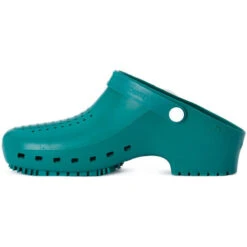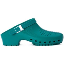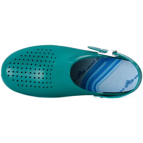 Zoccoli Calzuro modello S, certificati CE, latex free, antistatici, suola antiscivolo EN ISO 20347:2012, con fori laterali per la traspirazione del piede e tomaia verde forata. Calzuro è un Dispositivo Medico di Classe I non sterile. Modello con plantare e cinturino.